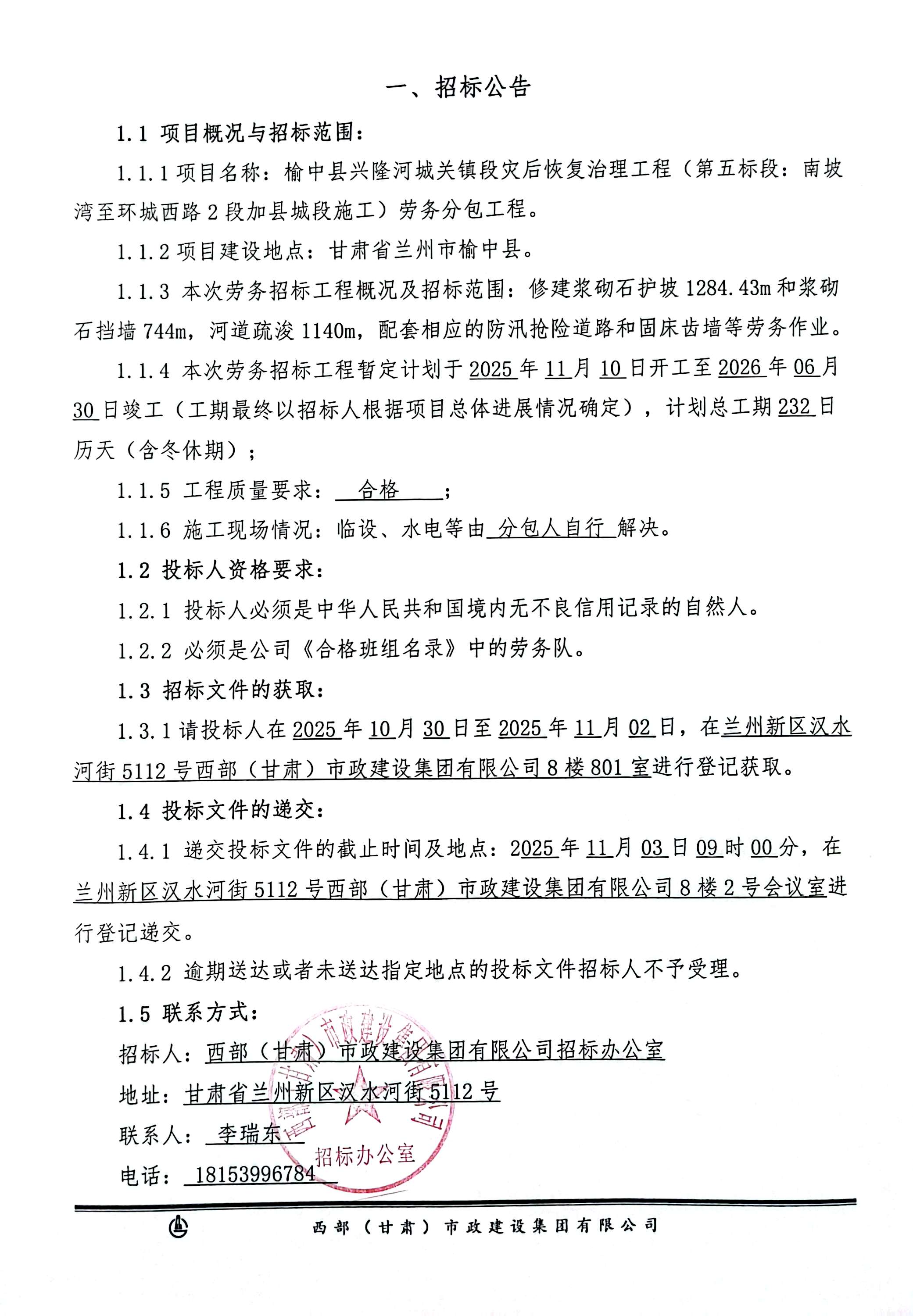 榆中縣興隆河城關(guān)鎮(zhèn)段災(zāi)后恢復(fù)治理工程(第五標(biāo)段:南坡灣至環(huán)城西路2段加縣城段施工)勞務(wù)分包工程-招標(biāo)公告
