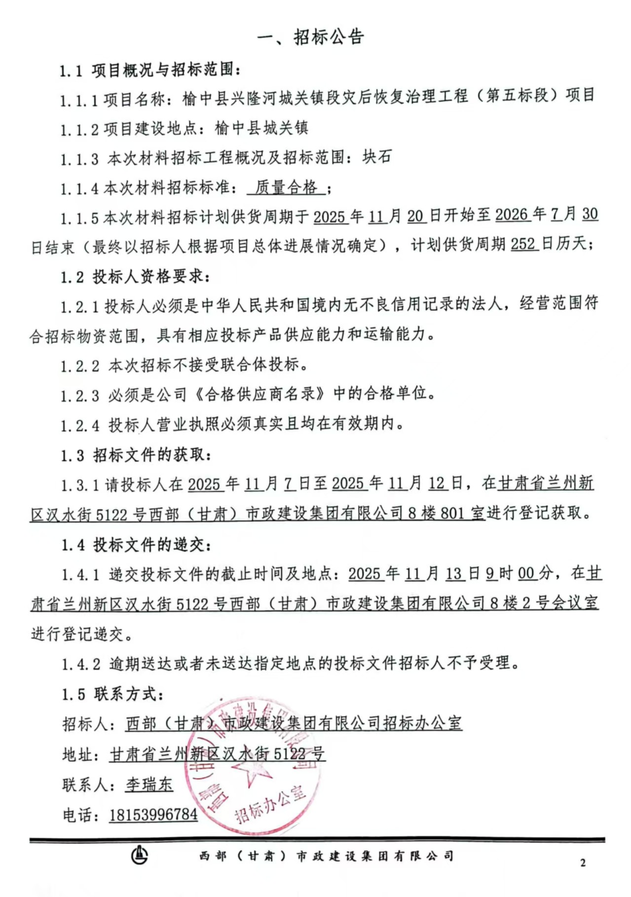 榆中縣興隆河城關(guān)鎮(zhèn)段災(zāi)后恢復(fù)治理工程(第五標(biāo)段)項目-塊石招標(biāo)公告