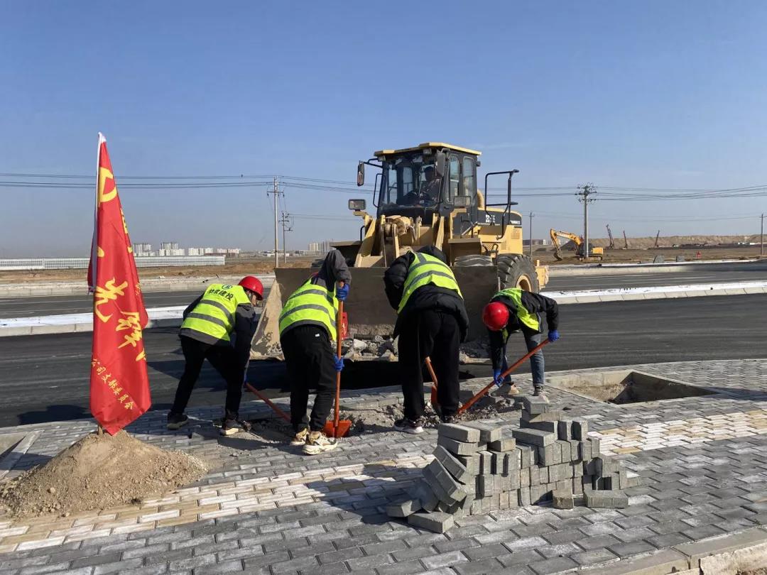 全體黨員、積極分子、入黨申請(qǐng)人發(fā)揮模范帶頭作用,主動(dòng)請(qǐng)纓,接替勞務(wù)工人崗位工作。不到半日,項(xiàng)目部便成立起一支28人組成的黨員先鋒隊(duì),第一時(shí)間投入到項(xiàng)目一線建設(shè)工作中。路燈電桿材料裝卸、交安工程基礎(chǔ)廢料清理、道路中水管道橫穿、人行道面包磚鋪設(shè),各作業(yè)面恢復(fù)了往日施工大干的忙碌場(chǎng)景。