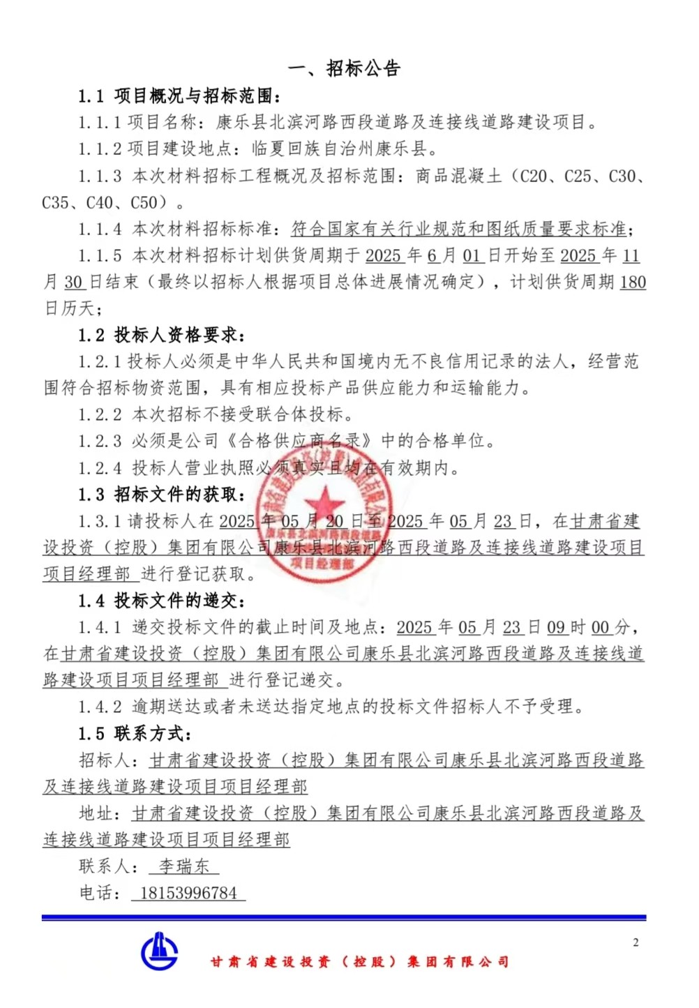 康樂縣北濱河路西段道路及連接線道路建設(shè)項(xiàng)目-商品混凝土-招標(biāo)公告