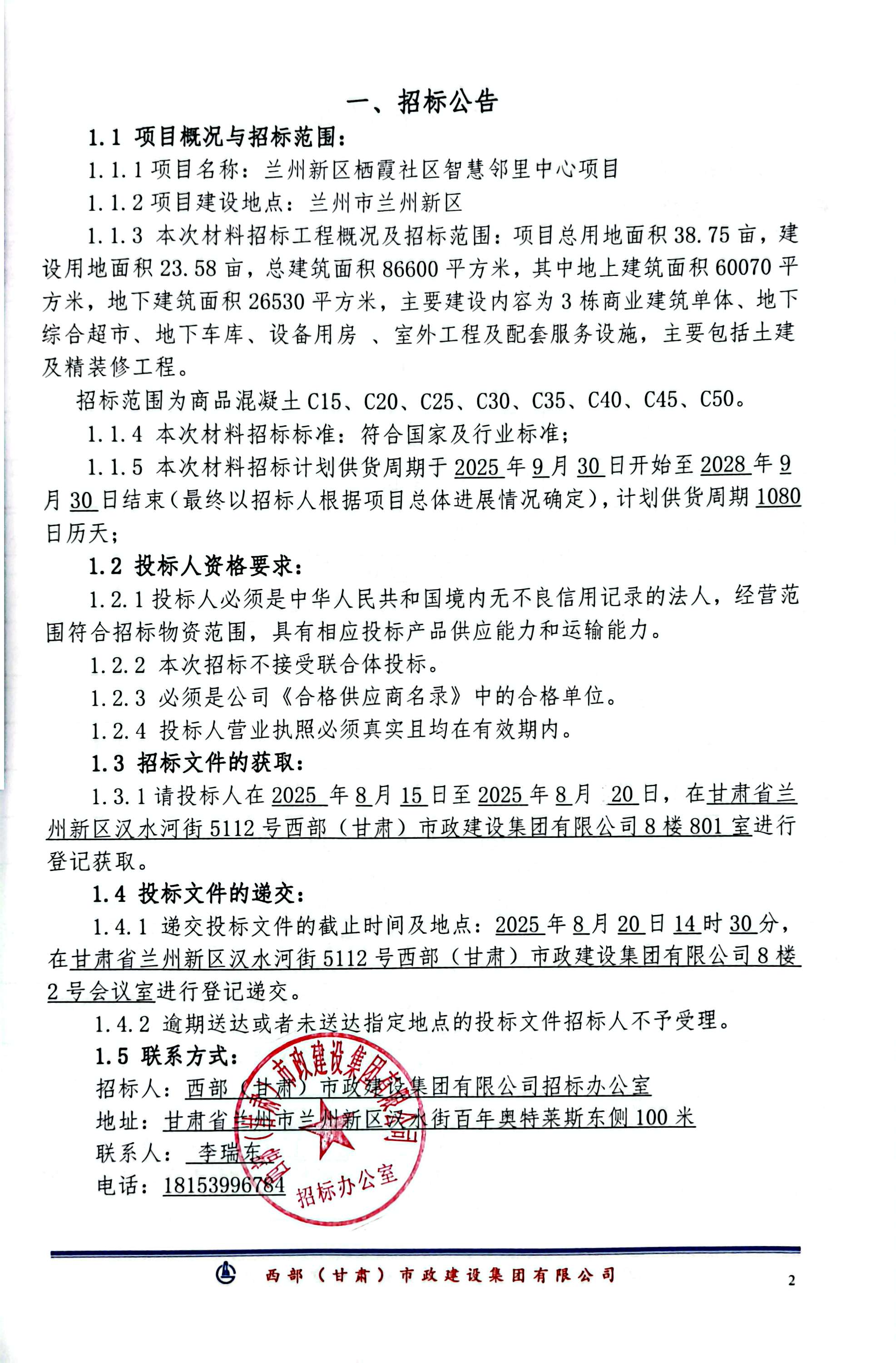 蘭州新區(qū)棲霞社區(qū)智慧鄰里中心項(xiàng)目-商品混凝土-招標(biāo)公告
